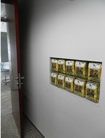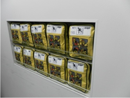 此款产品我们建议贵单位选择双包装(每个包装含两个头套)或软包装,可悬挂于墙上,如办公桌旁的墙上,方便就近拿取,也可集中悬挂于办公室、会议室门口墙上,以便发生火灾众人逃生时在出办公室前就取出戴好。如图所示(单个软包装):